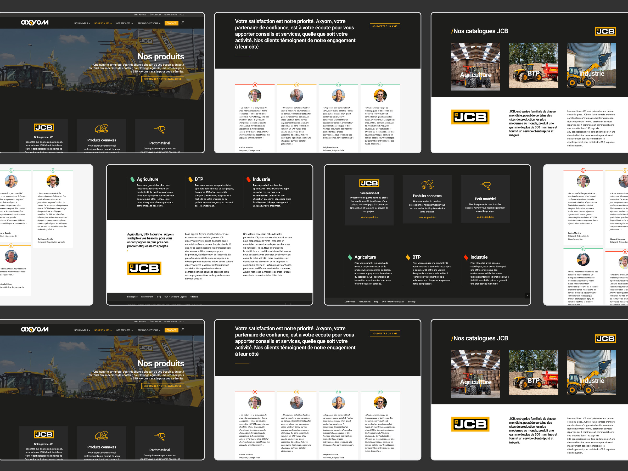 La typographie Roboto, issue de la fonderie Google, complète le dispositif : claire, moderne, et facilement déployable dans les outils bureautiques internes. Pour renforcer l’ancrage terrain, nous avons organisé une série de reportages photo réalisés par Florian Petit, mettant en scène les clients fidèles d’Axyom et leurs machines en action. Enfin, nous avons conçu une expérience utilisateur fluide : arborescence claire, hiérarchie de l’information, mise en avant des services et navigation intuitive. Un site aussi robuste et précis que les machines qu’Axyom propose.