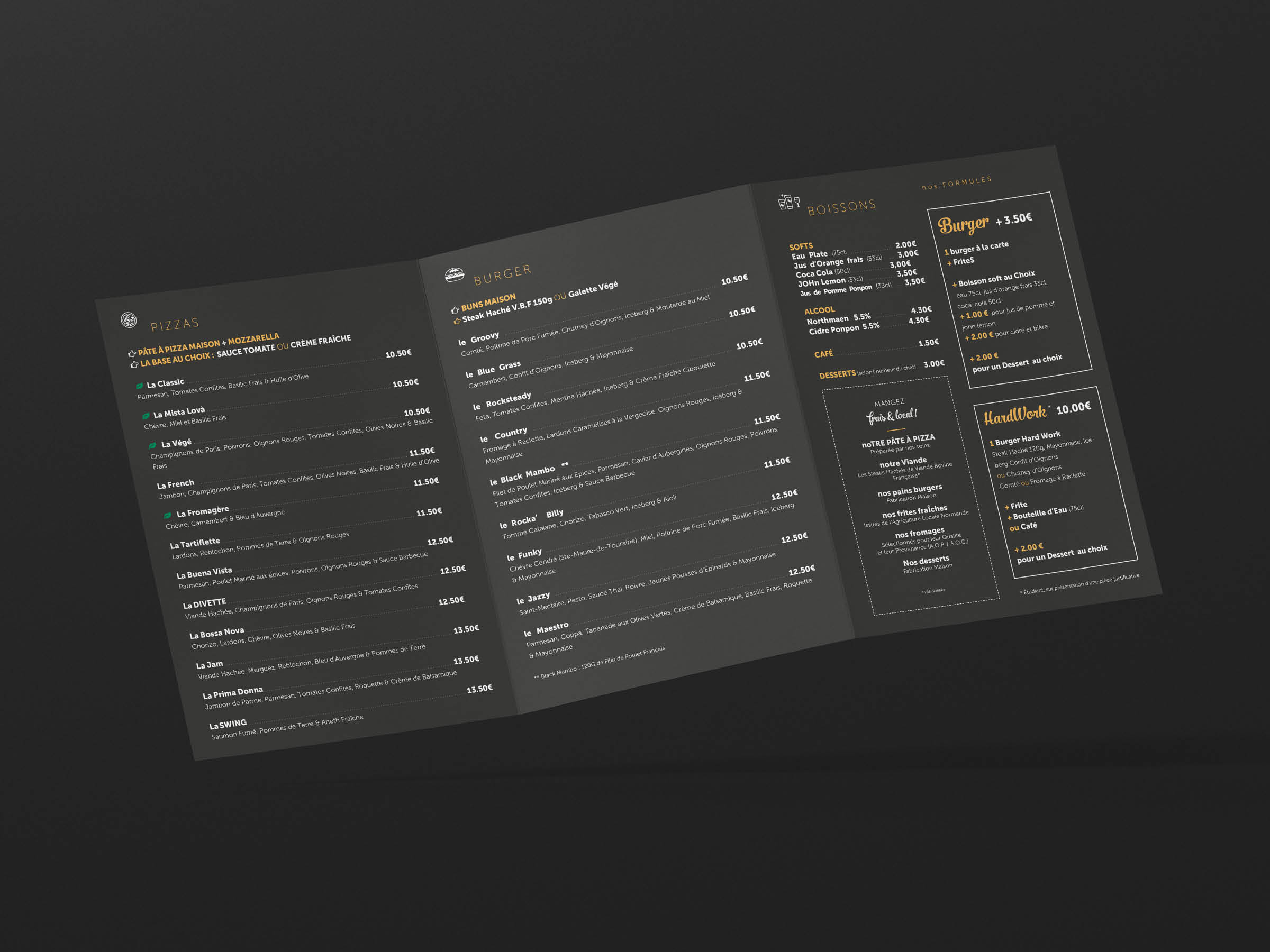 Dans un premier temps, nous avons décliné l’identité sur des supports print : menus, flyers, encarts promotionnels, en veillant à conserver une cohérence visuelle forte. L’univers graphique reflète l’énergie du lieu et la qualité de l’expérience proposée.